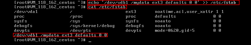 cat /etc/fstab出现如图最下方框选的 vdb1 信息则说明添加分区信息成功。
